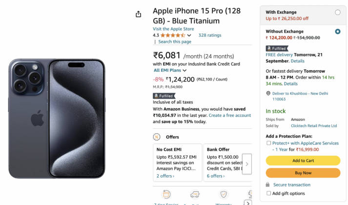 iPhone 16, 16 Plus, 16 Pro और 16 Pro Max की सेल 20 सितंबर से इंडिया में शुरू हो गई है। कुछ लोगों को जहां नए आईफोन 16 का इंतजार था तो कुछ इस बाट में थे कि कब पुराने आईफोन मॉडल्स के प्राइस कम होंगे और उनपर ऑफर्स आएंगे। वो दिन आज आ गया है। iPhone 15 Pro 33,000 रुपये सस्ता बिक रहा है। यह आईफोन कम प्राइस पर कैसे और कहां पर मिलेगा, यह जानकारी आप आगे पढ़ सकते हैं।
