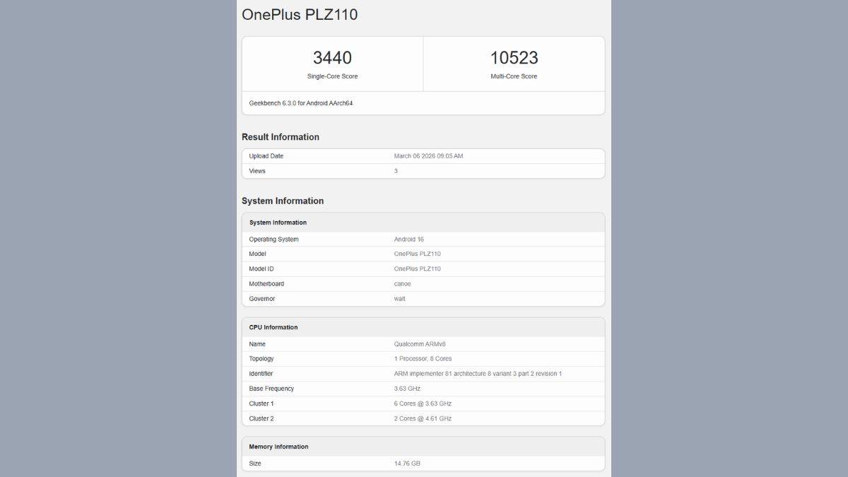 Geekbench लिस्टिंग के अनुसार OnePlus 15T का मॉडल नंबर PLZ110 है। इस प्लेटफार्म पर आई जानकारी के अनुसार फोन में लेटेस्ट Qualcomm Snapdragon 8 Elite Gen 5 प्रोसेसर दिया जा सकता है। जो फ्लैगशिप सेगमेंट का पावरफुल चिपसेट माना जाता है। बेंचमार्क स्कोर की बात करें तो इस स्मार्टफोन ने सिंगल-कोर टेस्ट में 3,440 और मल्टी-कोर टेस्ट में 10,523 अंक हासिल किए हैं। इसके अलावा लिस्टिंग में यह भी सामने आया है कि फोन में करीब 16GB RAM दी जाएगी और यह लेटेस्ट Android 16 पर काम कर सकता है।