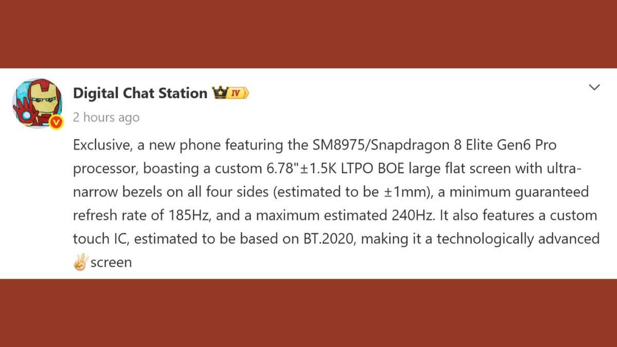 OnePlus 16 की लेटेस्ट जानकारी टिप्स्टर Digital Chat Station ने माइक्रो ब्लॉग्गिंग साइट वीबो पर शेयर की है। लीक के अनुसार, इसमें 6.78-इंच का कस्टम BOE LTPO फ्लैट डिस्प्ले मिल सकता है, जो 1.5K रिजॉल्यूशन के साथ आ सकता है। खास बात यह है कि इस डिस्प्ले में LIPO पैकेजिंग टेक्नोलॉजी का इस्तेमाल किया जा सकता है, जिससे चारों तरफ बेहद पतले और लगभग 1mm के सिमेट्रिकल बेजल्स देखने को मिल सकते हैं। जो इसे प्रीमियम लुक प्रदान करेंगे।