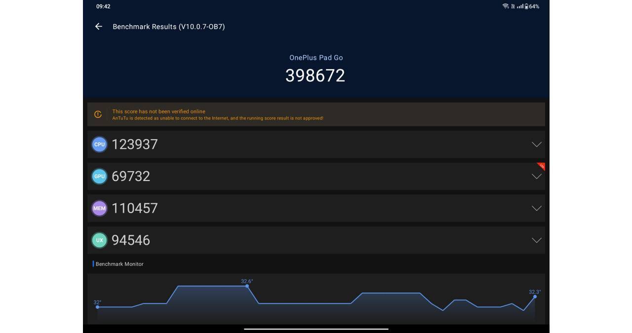 अपने रिव्यू के दौरान हमने इस टैब को कई बेंचमार्क पर टेस्ट किया, जहां परफॉर्मेंस बेंचमार्क एनटूट पर यह 3,98,672 का स्कोर कर पाया, जबकि गीकबेंच पर सिंगल कोर में 637 और मल्टीकोर में यह 1,772 तक का स्कोर कर पाया। ग्राफिक्स बेंचमार्क जीएफएक्स बेंच पर यह 2,274 का मैनहटन स्कोर कर पाया। इसके साथ ही 3डी मार्क पर 372 तक स्कोर गया। कुल मिलाकर देखें, तो स्कोर औसत ही है। बहुत अच्छा नहीं कह सकते। परंतु एक बजट टैबलेट से बहुत ज्यादा आशा भी नहीं कर सकते। एक बात जरूर कहूंगा कि मीडियाटेक का यह प्रोसेसर काफी स्थिर परफॉर्मेंस के लिए जाना जाता है और सीपीयू थ्रॉटलिंग में हमें देखने को भी मिला। टैब 94 प्रतिशत तक स्टेबल था, तो कि अच्छा कहा जा सकता है।