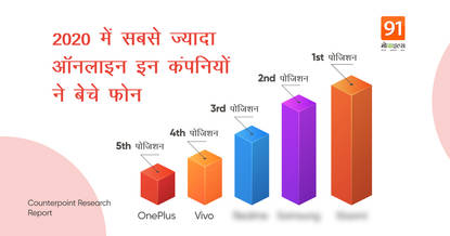 Realme ने भी अपनी बाजार हिस्सेदारी 19 प्रतिशत तक बढ़ा दी थी जबकि वीवो ने चौथे स्थान पर कब्जा किया और OnePlus ने ऑनलाइन स्मार्टफोन बाजार में पांचवीं रैंक हासिल की थी।