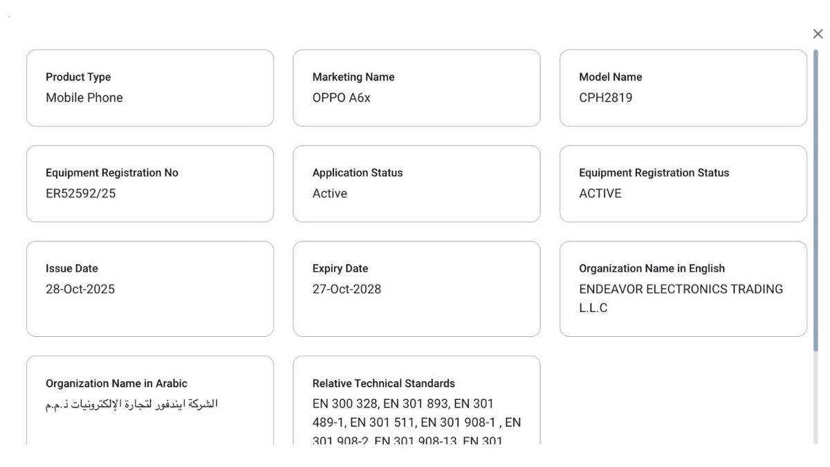 UAE की TDRA लिस्टिंग के अनुसार, Oppo A6 4G का मॉडल नंबर CPH2817 और Oppo A6x 4G का मॉडल नंबर CPH2819 है। दोनों डिवाइसों को 27 अक्टूबर को मंजूरी मिली है, जिनके सर्टिफिकेशन नंबर क्रमशः ER52591/25 और ER52592/25 हैं। यह मंजूरी इस बात का संकेत है कि दोनों फोन्स का डेवलपमेंट फेज लगभग पूरा हो चुका है और अब Oppo इनके आधिकारिक लॉन्च की तैयारी में जुट गया है।