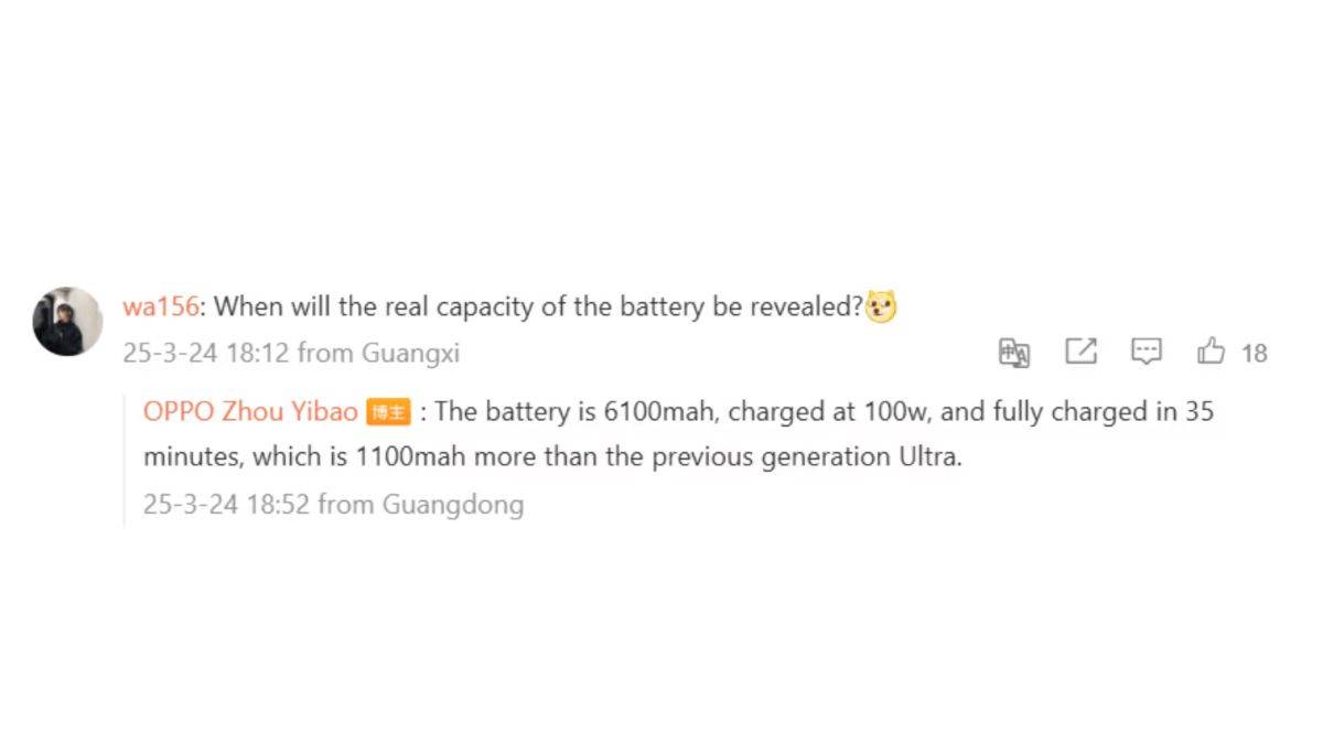 • OPPO की Find-सीरीज के प्रोडक्ट मैनेजर, झोउ यिबाओ ने माइक्रोब्लॉगिंग प्लेटफार्म Weibo पर खुलासा किया कि Find X8 Ultra में 6,100mAh बैटरी सेल होगी।