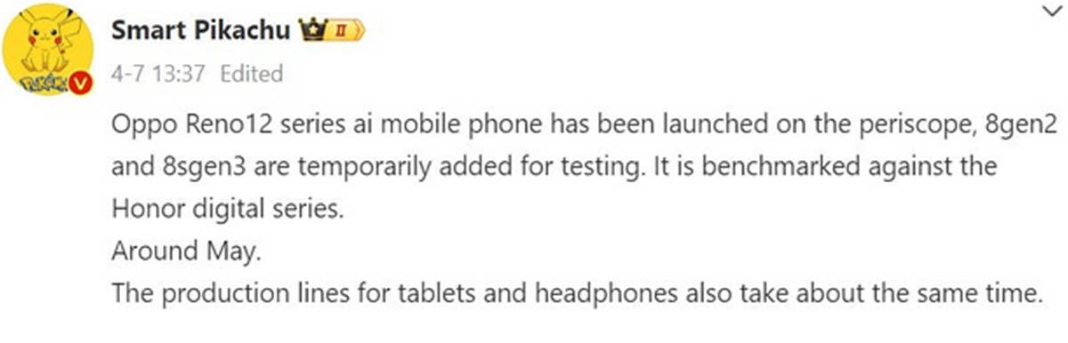 ओपो रेनो 12 सीरीज के जुड़ा यह लीक चाइना से सामने आया है। चीनी माइक्रोब्लागिंग साइट वेईबो पर स्मार्ट पिकाचू नाम के एक टिपस्टर ने लिखा है कि ओपो अपनी नई रेनो सीरीज को मई 2024 में चीन में लॉन्च कर सकती है। फिलहाल कोई तय लॉन्च डेट तो सामने नहीं आई है लेकिन लीक में दावा किया गया है कि अगले महीने ही OPPO Reno 12 और OPPO Reno 12 Pro चाइना में लॉन्च हो सकती है।