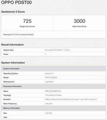 इसके अलावा गीकबेंच में सामने आया है कि डिवाइस एंडरॉयड 11 ओएस के साथ आएगा। वहीं, फोन में क्वालकॉम स्नैपड्रैगन 765G प्रोसेसर और 8GB की रैम होगी। दूसरी ओर OPPO PDST00 को सिंगल कोर में 725 और मल्टी-कोर में 3,000 अंक हासिल हुए हैं। यह डिवाइस भी एंडरॉयड 11 ऑपरेटिंग सिस्टम पर कार्य करेगा। इसके अलावा इस हैंडसेट में मीडियाटेक डाइमेंसिटी 1000+ प्रोसेसर और 8जीबी की रैम होगी। इसे भी पढ़ें: Oppo लाया दुनिया का सबसे अनोखा फोन, स्क्रीन को कर सकेंगे छोटा-बड़ा