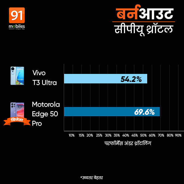 ऐसी प्रेशर की स्थिति में किसी फोन का प्रोसेसर अपनी जितनी अधिक क्षमता के साथ काम करता है, समझो वह उतना ही काबिल है। 91मोबाइल्स द्वारा किए गए थ्रॉटलिंग टेस्ट में Vivo T3 Ultra के प्रोसेसर ने जहां 54.2 प्रतिशत क्षमता का प्रदर्शन किया। वहीं Motorola Edge 50 Pro ने अपनी प्रोसेसिंग पावर का 69.6 प्रतिशत हिस्सा काम में लगाया।