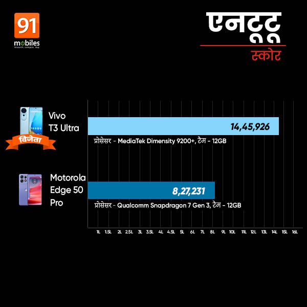 मोबाइल फोन में मौजूद CPU के साथ ही उनमें दिए गए GPU, Memory और UX की परफॉर्मेंस टेस्ट करने के लिए हमने वीवो टी3 अल्ट्रा तथा मोटोरोेला ऐज 50 प्रो में एनटूटू बेंचमार्क को रन किया। इस टेस्ट में Vivo T3 Ultra का एनटूटू स्कोर 14,45,926 आया। वहीं Motorola Edge 50 Pro का ओवरॉल एनटूटू स्कोर सिर्फ 8,27,231 रहा। वीवो और मोटोरोला के बीच 6 लाख का तगड़ा डिफरेंस देखने को मिला है।