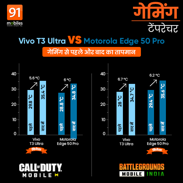 सीओडी गेम खेलने के दौरान वीवो टी3 अल्ट्रा की औसत फ्रेम रेट 52.6एफपीएस आई। मोबाइल गेमिंग के दौरान इस फोन का टेम्परेचर केवल 5.6 डिग्री ही बढ़ा तथा बैटरी 9 प्रतिशत ड्रॉप हुई। इसी गेम को खेलने के दौरान ऐज 50 प्रो की ऐवरेज फ्रेम रेट 54.9एफपीएस रही। यह फोन 6 डिग्री गर्म हो गया तथा बैटरी 8 प्रतिशत कम हो गई है।