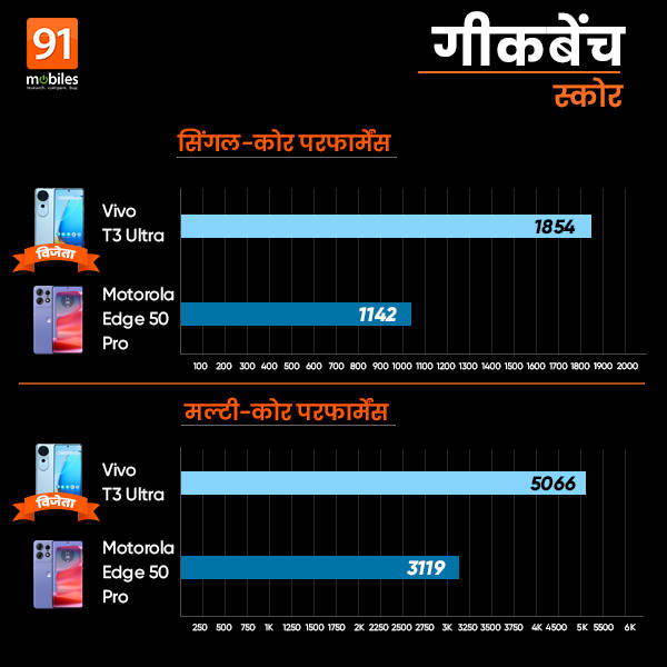 Vivo T3 Ultra का सिंगल-कोर गीकबेंच स्कोर 1854 आया। वहीं Motorola Edge 50 Pro 1142 प्वाइंट्स ही सिंगल-कोर में अचीव कर पाया। इसी तरह मल्टी-कोर बेंचमार्क टेस्ट में वीवो टी3 अल्ट्रा ने 5066 स्कोर हासिल किया तथा यहां मोटोरोला ऐज 50 प्रो का मल्टी-कोर गीकबेंच स्कोर 3119 आया।