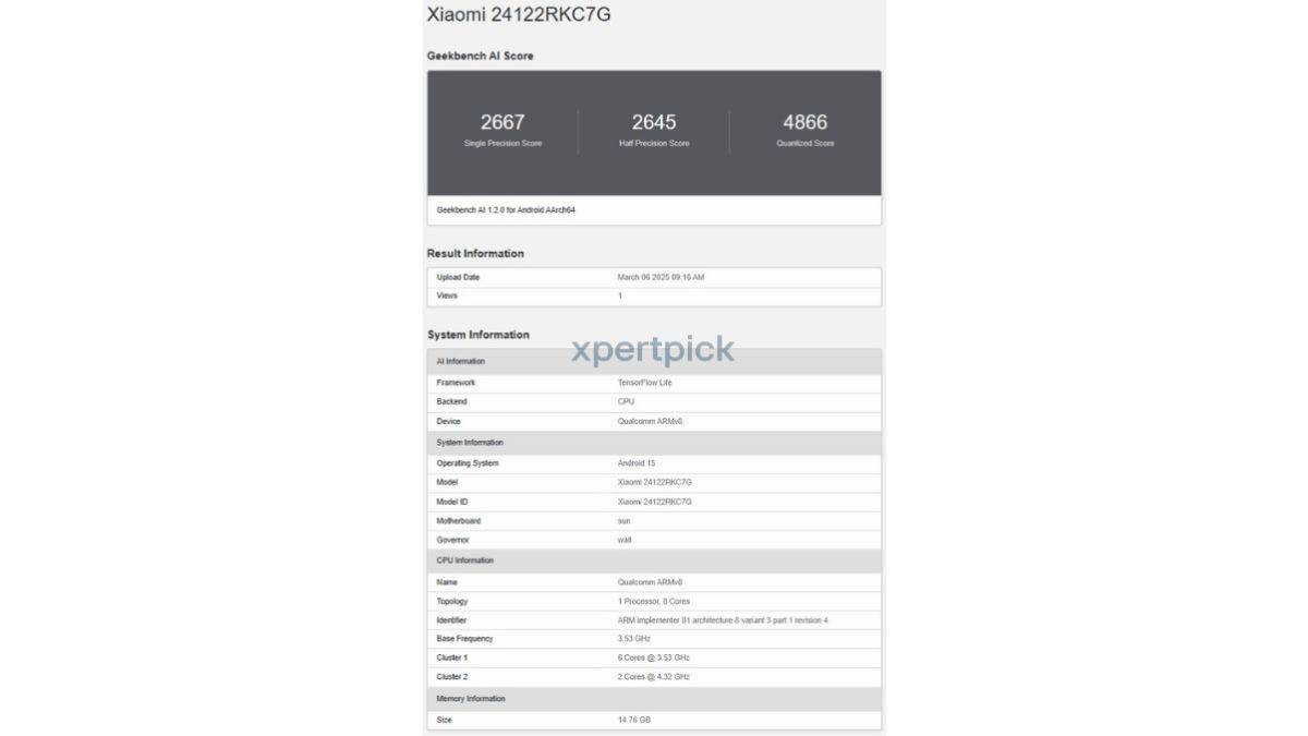 - आगामी डिवाइस लेबल “Xiaomi 24122RKC7G” है, Geekbench AI डेटाबेस में देखा गया है।