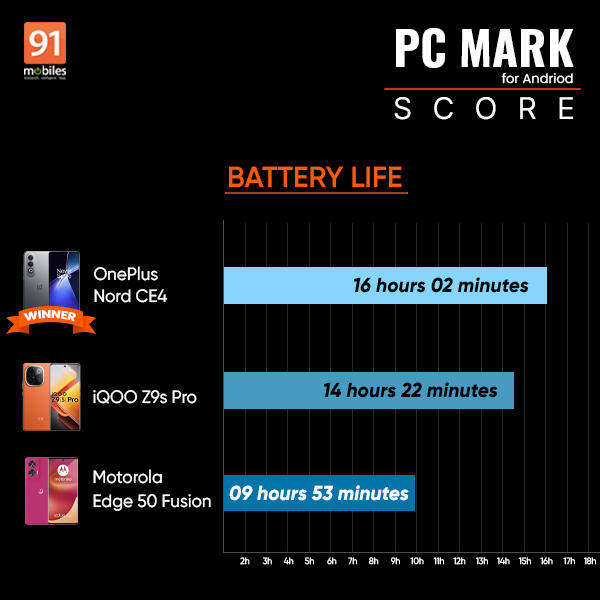 PCMark बैटरी बेंचमार्क टेस्ट चेक करता है कि स्मार्टफोन वीडियो प्लेबैक को कितनी देर तक हैंडल कर सकता है। हमने तीनों फोंस पर स्क्रीन ब्राइटनेस को 80 प्रतिशत पर सेट किया और ट्रैक किया कि बैटरी को फुल से 20 प्रतिशत तक गिरने में कितना समय लगा है। iQOO Z9s ने 14 घंटे 22 मिनट तक काम किया है। जबकि Motorola Edge 50 Fusion ने 9 घंटे 53 मिनट का समय दिया है। इनमें OnePlus Nord CE4 सबसे आगे रहा है। जो 16 घंटे 2 मिनट तक चला है। iQOO Z9s और OnePlus Nord CE4 का परफॉर्मेंस बेहतर था। क्योंकि इनमें बड़ी बैटरी है। बता दें कि रिजल्ट के अनुसार OnePlus Nord CE4 आपको सबसे अच्छी बैटरी लाइफ का भरोसा दे सकता है।