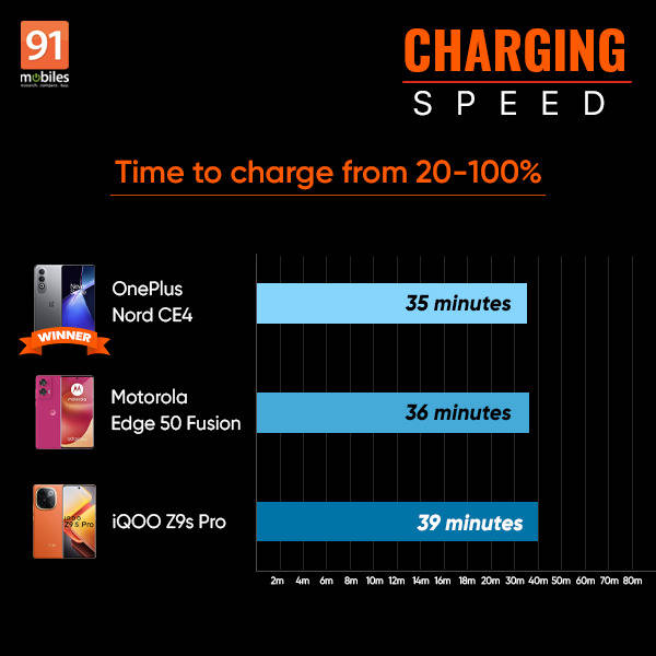तीनों ही फोन में शानदार फास्ट चार्जिंग सपोर्ट है। OnePlus Nord CE4 100W चार्जिंग के साथ सबसे आगे है, इसके बाद iQOO Z9s Pro 80W और Motorola Edge 50 Fusion 68W के साथ आता है। टेस्ट के जरिए हमने देखा कि हर एक फोन को 20 प्रतिशत से 100 प्रतिशत तक चार्ज होने में कितना समय लगा है। इनमें OnePlus Nord CE4 सबसे तेज था, जिसने सिर्फ 35 मिनट लिए हैं। जबकि Motorola Edge 50 Fusion 36 मिनट में और iQOO Z9s Pro को 39 मिनट लगे थे। एक बार फिर OnePlus Nord CE4 टॉप पर रहा है।