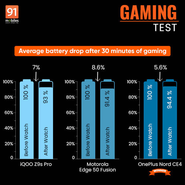 गेमिंग टेस्ट के लिए हमने तीनों डिवाइस पर समान वॉल्यूम और ब्राइटनेस सेटिंग्स के साथ BGMI, COD: Mobile और Real Racing 3 खेला है। हर गेम को लगभग 30 मिनट तक खेला गया है। इसके बाद हमने रिकॉर्ड किया कि डिवाइस में कितनी बैटरी खर्च हुई है। iQOO Z9s Pro की कुल बैटरी 21 प्रतिशत तक गिरी (प्रति गेम औसतन 7 प्रतिशत) है। जबकि Motorola Edge 50 Fusion में कुल 26 प्रतिशत गिरावट दर्ज की गई (औसतन 8.6 प्रतिशत) है। OnePlus Nord CE4 ने सबसे अच्छा रिजल्ट दिया है। जिसमें केवल 17 प्रतिशत की कुल गिरावट हुई (औसतन 5.6 प्रतिशत) है। यदि आप अक्सर अपने स्मार्टफोन पर गेमिंग करते हैं, तो OnePlus Nord CE4 आपको सबसे अच्छी बैटरी लाइफ प्रदान करेगा।