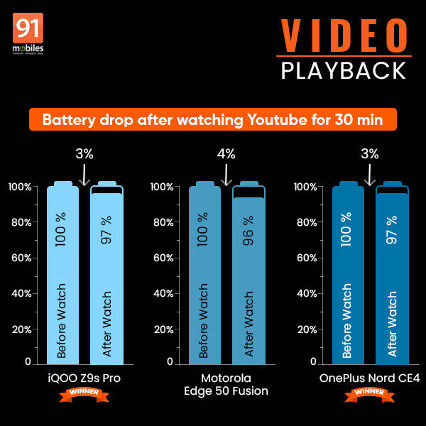 वीडियो स्ट्रीमिंग टेस्ट के लिए हमने तीनों फोंस पर एक ही YouTube वीडियो चलाया है। जिसमें ब्राइटनेस और वॉल्यूम को 50 प्रतिशत पर सेट किया गया था, ताकि यह देखा जा सके कि बैटरी कितनी खर्च होती है। iQOO Z9s Pro और OnePlus Nord CE4 दोनों में 3 प्रतिशत बैटरी की गिरावट दर्ज की गई है। जबकि Motorola Edge 50 Fusion में थोड़ा ज्यादा, यानी 4 प्रतिशत की गिरावट हुई है। चूंकि iQOO Z9s Pro और OnePlus Nord CE4 में बड़ी बैटरी है। इसलिए इनमें कम बैटरी खर्च हुई है। यदि आप वीडियो देखने या शो स्ट्रीम करने का आनंद लेते हैं, तो iQOO Z9s Pro और OnePlus Nord CE4 आपके लिए ज्यादा बेहतर हैं।