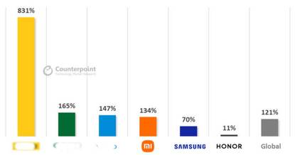 काउंटरपॉइंट रिसर्च की रिपोर्ट में कहा गया है कि 2021 की तीसरी तिमाही में रियलमी सबसे तेजी से बढ़ने वाला 5जी एंडरॉयड स्मार्टफोन ब्रांड था। चीनी निर्माता की 5जी स्मार्टफोन की बिक्री में सालाना आधार पर 831 प्रतिशत की वृद्धि हुई, जबकि बाकी बाजार में औसतन 121 प्रतिशत की वैश्विक वृद्धि देखी गई। भारत, चीन और यूरोप में कंपनी का सबसे ज्यादा विकास हुआ है।