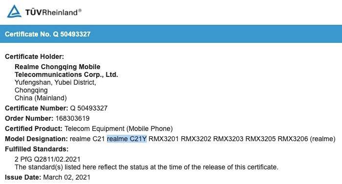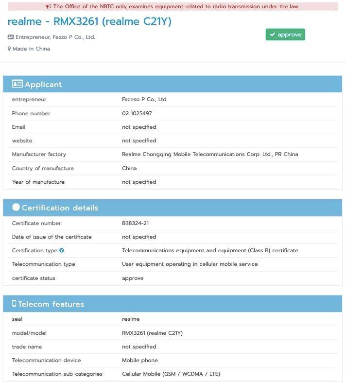 Realme काफी समय से भारतीय बाजार में अपने लो बजट स्मार्टफोन सेगमेंट पर ज्यादा ध्यान दे रही है। वहीं, कुछ समय पहले एक रिपोर्ट सामने आई थी, जिसके मुताबिक Realme C25s नाम का नया फोन जल्द ही इंडिया में लॉन्च होने वाला है। इसके अलावा काफी समय से खबर सामने आ रही है कि कंपनी C21 के नए वेरिएंट यानी C21Y को पेश करने की योजना बना रही है। यह फोन लॉन्च से पहले NBTC वेबसाइट पर स्पॉट हुआ है। लिस्टिंग में फोन का मॉडल नंबर व moniker पता लगा है। इसके अलावा अपकमिंग Realme स्मार्टफोन की कोई और जानकारी इस लिस्टिंग में सामने नहीं आई है।
