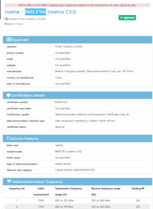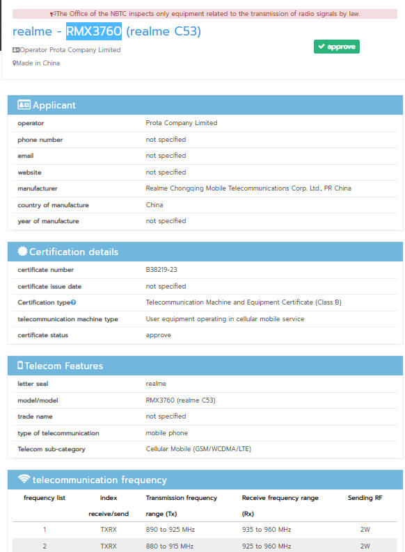 Realme C53 NBTC सर्टिफिकेशन्स डिटेल