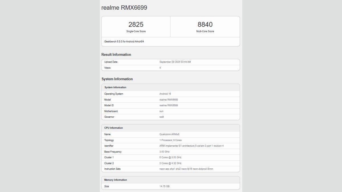 Geekbench लिस्टिंग के अनुसार मॉडल नंबर RMX6699 वाला डिवाइस Realme GT 8 होने की उम्मीद है। यह फोन Snapdragon 8 Elite चिपसेट के साथ आ सकता है। इसमें दो कोर 4.32GHz और छह कोर 3.53GHz पर काम कर सकते हैं। फोन में ग्राफिक्स के लिए Adreno 830 GPU दिया जा सकता है। स्पीड के लिए करीब 16GB RAM और ऑपरेटिंग सिस्टम के मामले में Android 16 मिलने की बात सामने आई है। डिवाइस ने गीकबेंच पर सिंगल-कोर टेस्ट में 2825 और मल्टी-कोर टेस्ट में 8840 अंक हासिल किए हैं। इसके अलावा, AnTuTu बेंचमार्क में फोन ने 3.32 मिलियन का स्कोर हासिल कर चुका है। जबकि 3C सर्टिफिकेशन के अनुसार, यह 100W चार्जिंग को सपोर्ट कर सकता है।