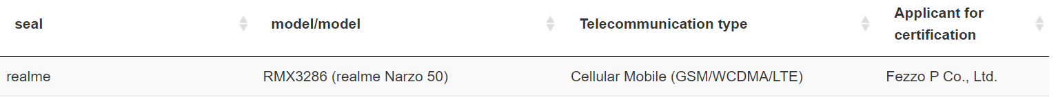 Realme ने इस साल भारतीय बाजार में अपनी नारज़ो 50 सीरीज़ को पेश करते हुए दो कम कीमत वाले स्मार्टफोन Realme Narzo 50A और Realme Narzo 50i लॉन्च किया था। इन दोनों रियलमी फोंस ने लो बजट में एंट्री ली थी जिनमें नारज़ो 50आई की शुरूआती कीमत 7,499 रुपये और नारज़ो 50ए का शुरूआती प्राइस 11,499 रुपये था। इन फोन के लॉन्च के बाद 91मोबाइल्स का खबर प्राप्त हुई थी कि कंपनी इस सीरीज़ का विस्तार करते हुए इंडिया में दो नए स्मार्टफोन Realme Narzo 50 और Realme Narzo 50 Pro भी लॉन्च करने वाली है। हालांकि, अभी तक Narzo 50 और Realme Narzo 50 Pro लॉन्च नहीं हुए हैं। वहीं, अब ऐसा लग रहा है कि Realme जल्द ही Realme Narzo 50 स्मार्टफोन पेश करने की तैयारी कर रहा है। हाल ही में Realme Narzo 50 को BIS, EEC, इंडोनेशिया टेलीकॉम और NBTC सर्टिफिकेशन प्राप्त हुए हैं। इन सर्टिफिकेशन से डिवाइस के मॉडल नंबर का पता चलता है और यह पुष्टि करता है कि उपनाम Realme Narzo 50 होगा।
