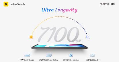 Realme का अपकमिंग Realme Pad टैबलेट को MediaTek Helio G80 SoC के साथ पेश किया जाएगा। Realme Pad टैबलेट में बड़ी 7,100mAh की बैटरी दी जाएगी। इस बैटरी को लेकर कंपनी का दावा है कि यह 65 दिनों तक का स्टेंडबाई बैकअप ऑफर करता है। इसके साथ ही रियलमी का टैबलेट 18W क्विक चार्ज सपोर्ट करता है।