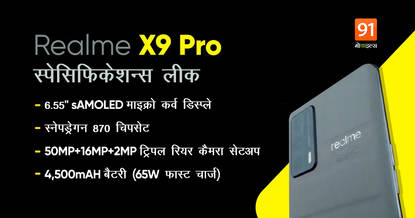 Realme X9 Pro स्मार्टफोन में 6.55-इंच Samsung E3 Super AMOLED डिस्प्ले दी जा सकती है जो माइक्रो कर्व्ड स्क्रीन होगी। रियलमी का यह फोन Qualcomm Snapdragon 870 चिपसेट के साथ पेश किया जा सकता है। रियलमी का यह स्मार्टफोन LPDDR4x RAM और UFS 3.1 स्टोरेज के साथ पेश किया जा सकता है। Realme X9 Pro स्मार्टफोन में 4,500mAh बैटरी और 65W फास्ट चार्जिंग सपोर्ट दिया जा सकता है। यह भी पढ़ें : Exclusive : Vivo V21e 5G स्मार्टफोन भारत में जल्द होगा लॉन्च, स्पेसिफिकेशन्स हुईं लीक
