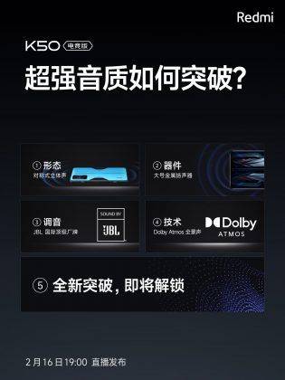 Xiaomi ने कंफर्म किया है कि Redmi K50 Gaming स्मार्टफोन में सिमिट्रिकल स्टीरियो स्पीकर दिया जाएगा। इन स्पीकर को JBL ट्यून करेगा। इसके साथ ही K50 Gaming स्मार्टफोन में Dolby Atmos सपोर्ट दिया जाएगा। रेडमी के इस स्मार्टफ़ोन की डिस्प्ले की बात करें तो यह फ़्लैट डिस्प्ले दिया जाएगा, जिसमें सेल्फ़ी कैमरा के लिए पंच होल कटआउट दिया जाएगा। रेडमी के अपकमिंग गेमिंग स्मार्टफ़ोन में ट्रिपल रियर कैमरा सेटअप दिया जाएगा। कैमरा सेटअप के चारों ओर LED फ्लैश दिया जाएगा।
