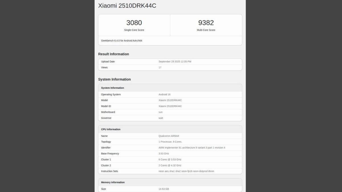 गीकबेंच पर Redmi K90 को 2510DRK44C मॉडल नंबर के साथ देखा गया है। बेंचमार्क स्कोर की बात करें तो इस आगामी स्मार्टफोन ने सिंगल-कोर टेस्ट में 3080 और मल्टी-कोर टेस्ट में 9382 अंक हासिल किए हैं। लिस्टिंग के अनुसार यह परफॉरमेंस के लिए क्वालकॉम के नए Snapdragon 8 Elite Gen 5 चिपसेट के साथ आ सकता है।