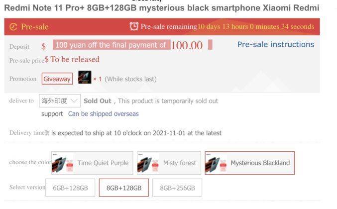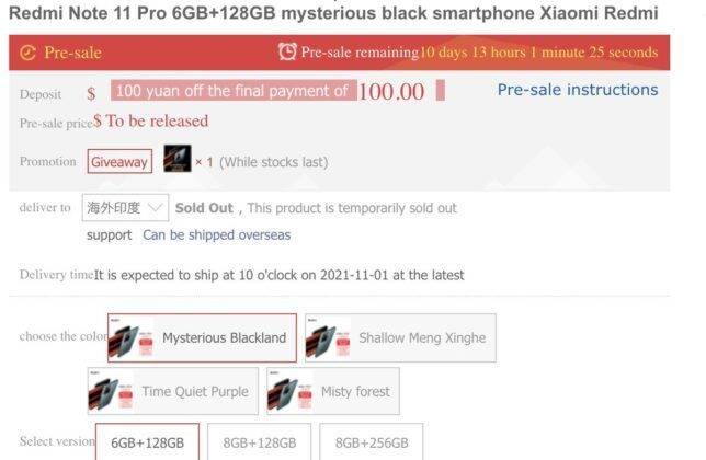 रेडमी के दोनों डिवाइसेस Redmi Note 11 Pro और Pro+ चाइनीज ई-कॉमर्स वेबसाइट JD.com पर लिस्ट किए गए हैं। Redmi Note 11 Pro स्मार्टफोन को तीन वेरिएंट्स – 6GB/128GB, 8GB/128GB, और 8GB/256GB में पेश किया जाएगा। इसके साथ ही यह स्मार्टफ़ोन चार कलर ऑप्शन – ब्लैक, फॉरेस्ट, पर्पल और शैलो मेंग में पेश किया जा सकता है। वहीं Redmi Note 11 Pro+ की बात करें तो यह भी सेम मैमोरी वेरिएंट्स में पेश किया जाएगा। इसके साथ ही यह फोन तीन कलर ऑप्शन – मिस्टीरियस ब्लैक, मिस्टी फॉरेस्ट और क्वाइट पर्पल में लॉन्च किया जा सकता है।