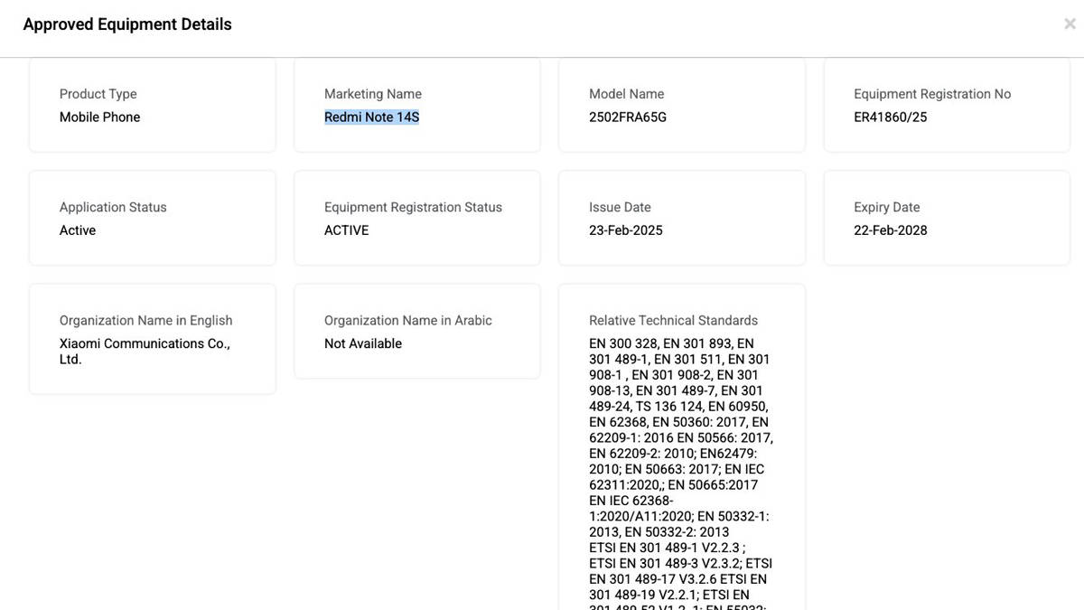 अपकमिंग रेडमी फोन नोट 14एस को दुबई की सर्टिफिकेशन्स साइट टीडीआरए पर लिस्ट किया गया है जिसकी जानकारी हमें टिपस्टर मुकुल शर्मा के जरिये प्राप्त हुई है। यहां फोन को 2502FRA65G मॉडल नंबर के साथ सर्टिफाइड किया गया है जिसके साथ मोबाइल का नाम Redmi Note 14S लिखा गया है। लिस्टिंग में हालांकि फोन के फीचर्स या स्पेसिफिकेशन्स की जानकारी नहीं मिली है लेकिन यह जरूर साफ हो गया है कि शाओमी अपने नए मोबाइल रेडमी नोट 14एस पर काम शुरू कर चुकी है जिसे आने वाले दिनों में बाजार में उतारा जा सकता है।