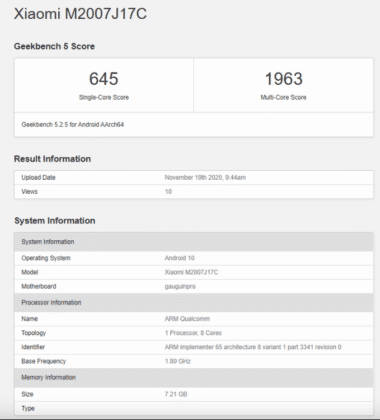 बेंचमार्किंग साइट Geekbench लिस्टिंग के अनुसार Redmi Note 9 Pro 5G में क्वालकॉम स्नैपड्रैगन 750G चिपसेट होगा। इसके अलावा इसमें ग्राफिक्स के लिए Adreno 619 GPU दिया जाएगा। साथ ही बेंचमार्किंग साइट पर सामने आया है कि रेडमी नोट 9 प्रो 5जी में 8GB की रैम और एंडरॉयड 10 ऑपरेटिंग सिस्टम होगा। इतना ही नहीं डिवाइस को सिंगल-कोर में 645 अंक और मल्टी कोर में 1963 अंक मिले हैं। इसे भी पढ़ें: 108 मेगापिक्सल कैमरा के साथ आएगा Xiaomi Mi 11 स्मार्टफोन, Samsung Galaxy S21 की टक्कर में होगा लॉन्च