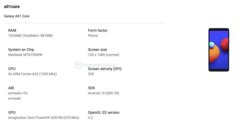 लिस्टिंग के अनुसार Samsung Galaxy A01 Core में MediaTek MT6739 प्रोसेसर होगा जो कि 4x ARM कोर्टेक्स-A53 कोर्स क्लॉक 1500MHz के साथ आएगा। चिपसेट के साथ फोन में 1GB की रैम दी जाएगी। साथ ही इसमें PowerVR GE8100 GPU होगा। इन सबके अलावा Samsung Galaxy A01 Core में एचडी डिसप्ले हो सकती है। इस डिवाइस में दी जाने वाली स्क्रीन का पिक्सल रेज्लोयूशन 720 x 1,480 और स्क्रीन डेंसिटी 320 DPI होगा। सॉफ्टवेयर की बात करें तो गैलेक्सी ए01 कोर लेटेस्ट एंडरॉयड 10 ऑपरेटिंग सिस्टम पर काम करेगा इसे भी पढ़ें:108MP कैमरे और 50x जूम के साथ आ रहा सैमसंग का नया फोन, शाओमी को देगा चुनौती
