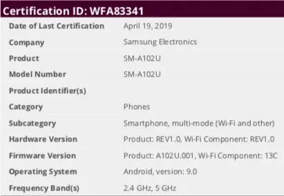 सैमसंग के इस आगामी स्मार्टफोन को ब्लूटूथ सर्टिफिकेशन्स साइट एसआईजी और वाईफाई सर्टिफिकेशन्स साइट वाईफाई अलायंस पर देखा गया है। इस दोनों वेबसाइट पर Galaxy A10e को SM-A102U मॉडल नंबर के साथ लिस्ट किया गया है। वेबसाइट्स पर सर्टिफाइड होने से यह तो साफ हो ही गया है कि सैमसंग गैलेक्सी ए10ई को लॉन्च करने की तैयारी में है। वहीं दूसरी ओर इस वेबसाइट्स पर फोन के फीचर्स व स्पेसिफिकेशन्स से जुड़ी जानकारी भी मिली है।