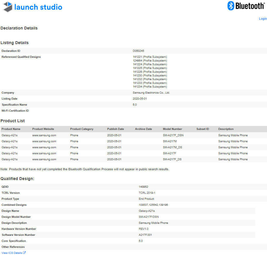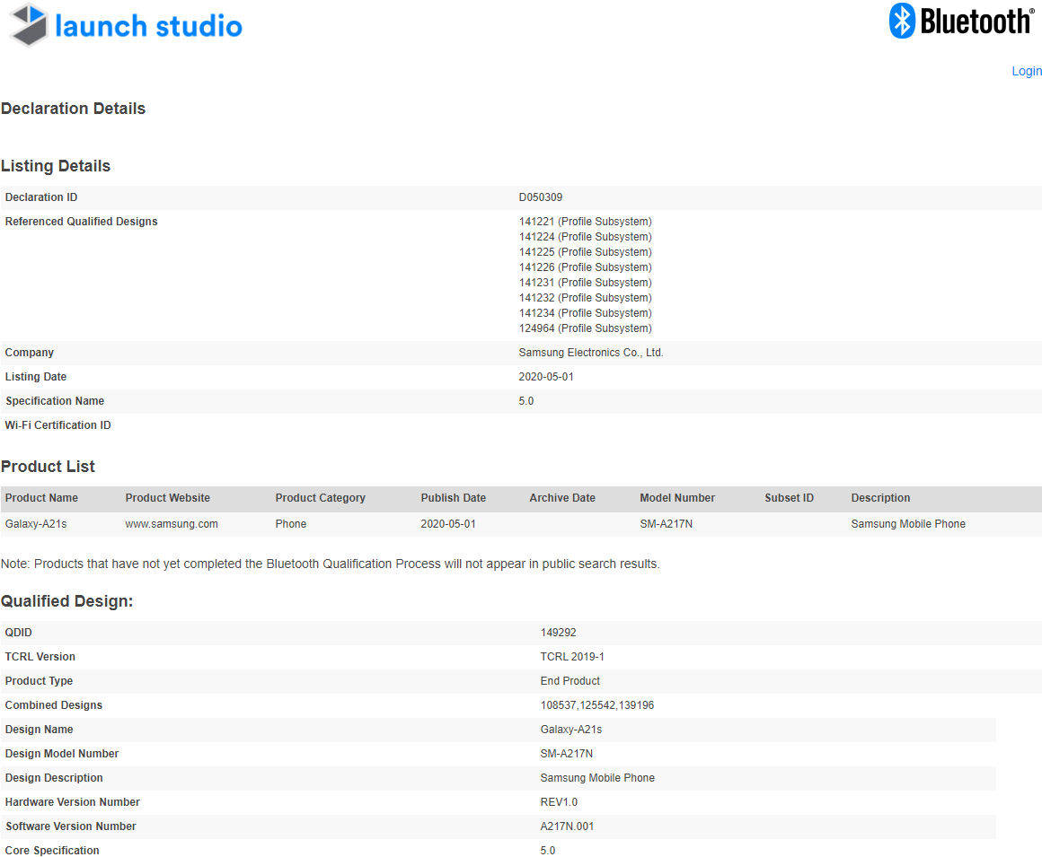 Samsung Galaxy A21s को दरअसल ब्लूटूथ एसआईजी पर लिस्ट किया गया है। इस लिस्टिंग में गैलेक्सी ए21एस नाम का यूज़ किया गया है। गौरतलब है कि यह पहली बार है जब किसी सर्टिफिकेशन्स साइट पर इस फोन के नाम का जिक्र हुआ है। इस लिस्टिंग ने पुख्ता कर दिया है कि सैमसंग Galaxy A21s नाम के साथ नया फोन लॉन्च करने वाली है। वेबसाइट पर इस फोन को ब्लूटूथ वी5.0 से लैस बताया गया है तथा साथ ही पांच और मॉडल नंबर SM-A217F_DSN, SM-A217M, SM-A217M_DS, SM-A217F_DS और SM-A217N सामने आए है।