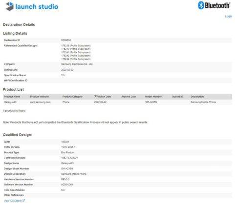 Samsung Galaxy A23 स्मार्टफोन जल्द लॉन्च होने वाला है। सैमसंग का यह स्मार्टफोन जल्द भी भारत और दूसरे इंटरनेशनल मार्केट में एंट्री करने वाला है। Samsung ने फिलहाल Galaxy A23 स्मार्टफोन के लॉन्च को लेकर ऑफिशियल ऐलान नहीं किया है। सैमसंग के इस बजट स्मार्टफोन को Bluetooth SIG सर्टिफिकेशन वेबसाइट पर लिस्ट किया गया है।