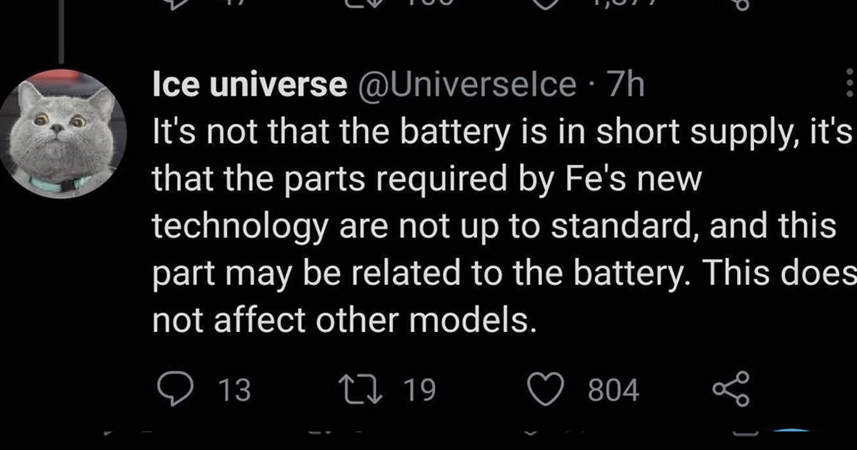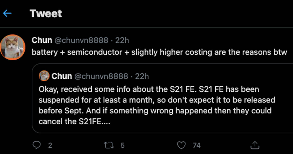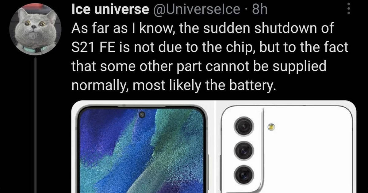 उपर मौजूद स्क्रीनशॉट ईमेज में आप देख सकते हैं सैमसंग गैलेक्सी एस21 एफई को लेकर टिप्सटर चुन ने कहा है कि इस फोन की बैटरी और चिपसेट के निर्माण में बाधा आ रही है। वहीं टिपस्टर ईवान ने हालात को साफ करते हुए बताया है कि सैमसंग के पास जो पार्ट्स फिलहाल मौजूद हैं वह एस21 एफई की टेक्नोलॉजी के स्टैंडर्ड को मैच नहीं कर पा रहे हैं और इस फोन के लिए नए पार्ट्स का निर्माण करना होगा। इस वजह से फोन के निर्माण में देरी होगी। लीक के मुताबिक हालात अगर जल्दी कंट्रोल में नहीं आते हैं तो हो सकता है कि Samsung Galaxy S21 FE इस साल लॉन्च ही न किया जाए।