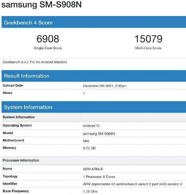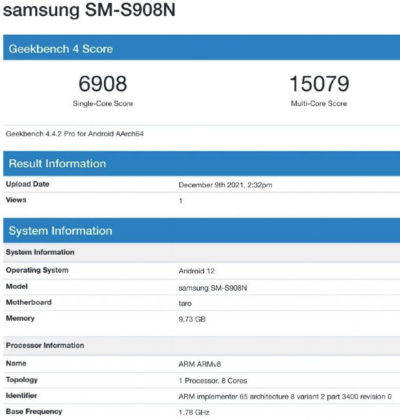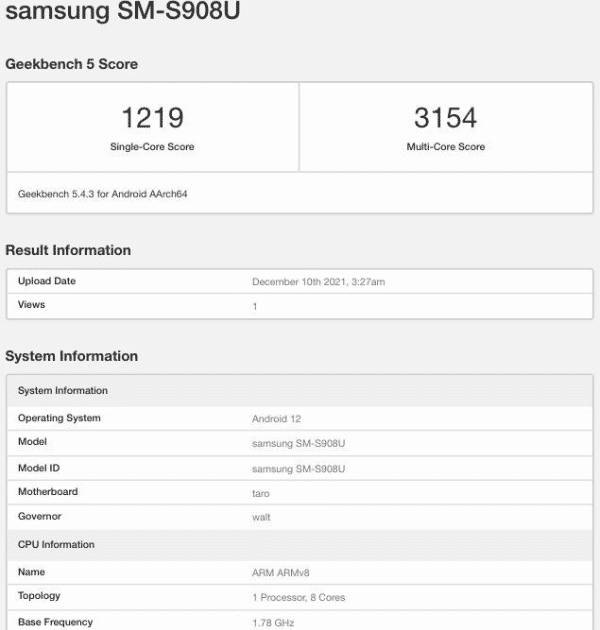 Geekbench 4 लिस्टिंग में Samsung Galaxy S22 Ultra स्मार्टफोन को मॉडल नंबर SM-S908N के साथ लिस्ट किया गया है। संभव है कि सैमसंग का यह फोन एशियन मार्केट में पेश किया जाएगा। सैमसंग के इस फोन के दूसरे वेरिएंट का मॉडल नंबर SM-908U के साथ Geekbench 5 में कम रैम के साथ पेश किया जाएगा।