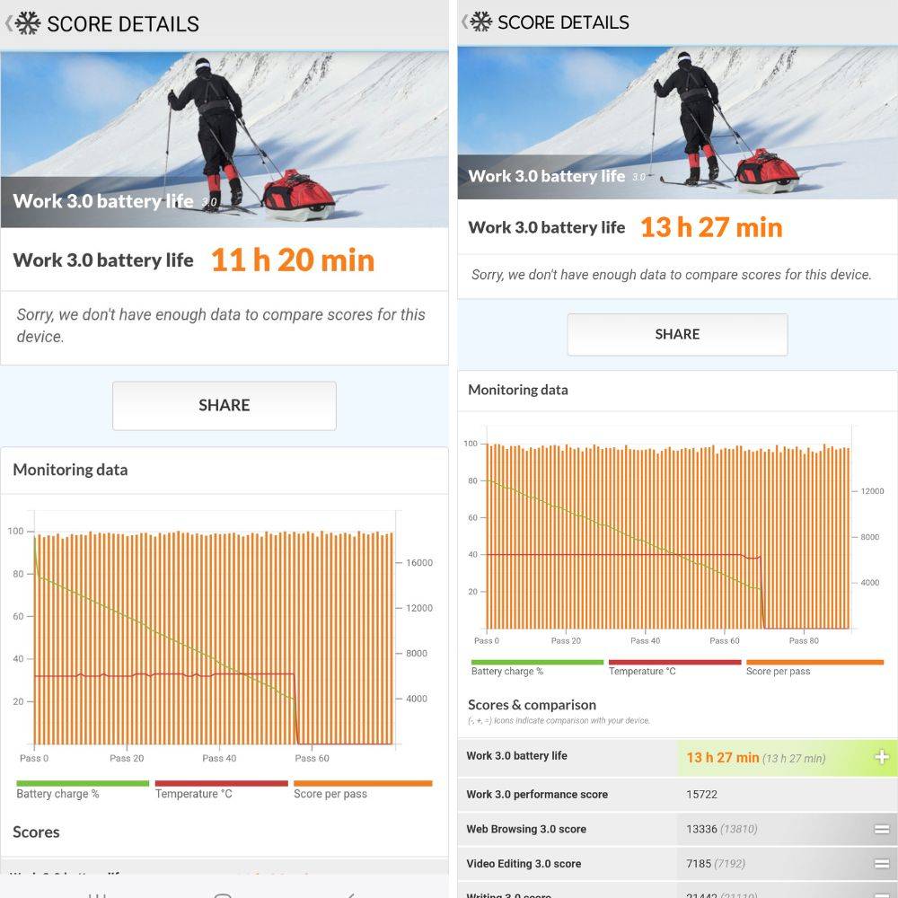 | PCMark score | 11 घंटे, 20 मिनट | 13 घंटे, 27 मिनट |