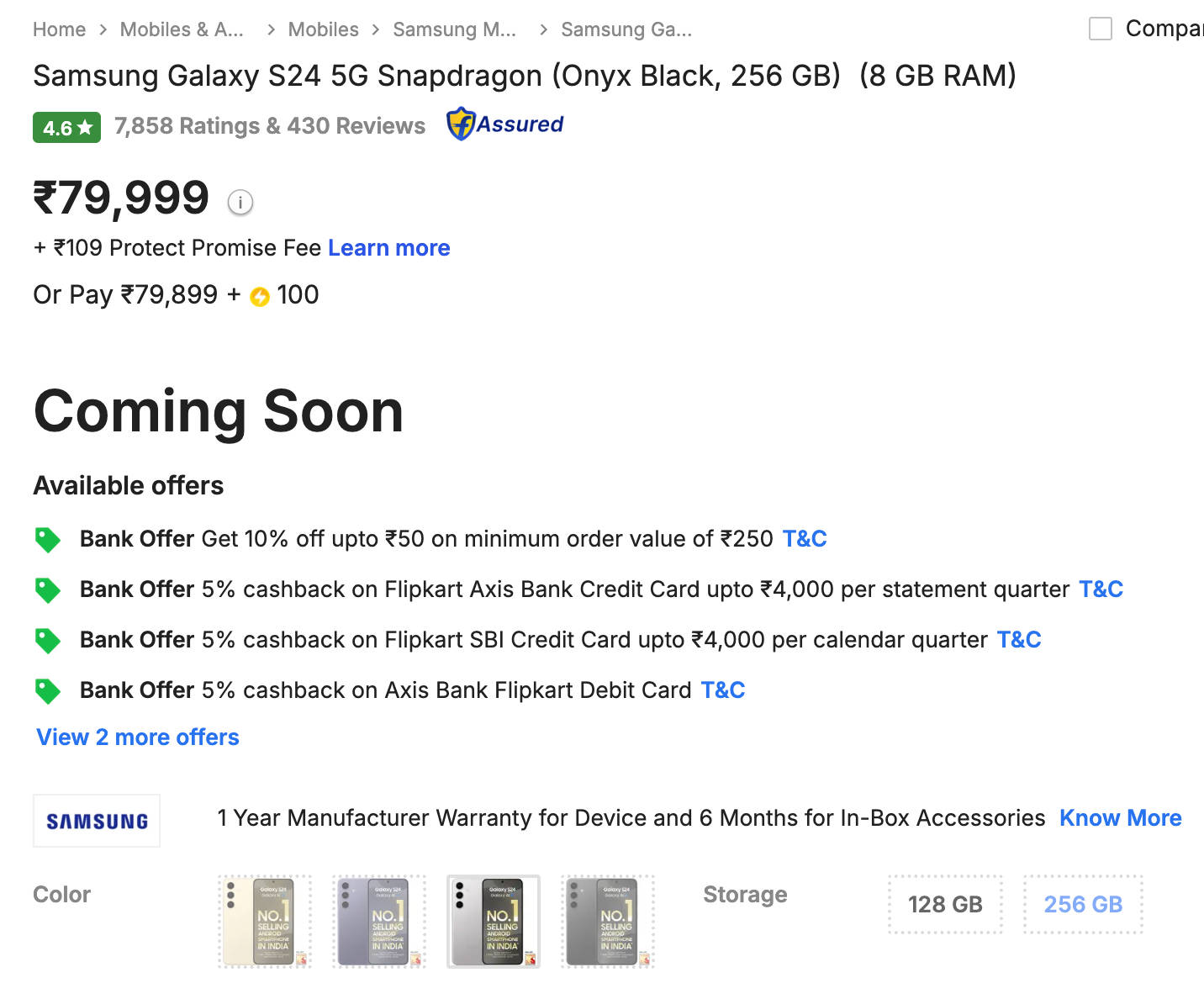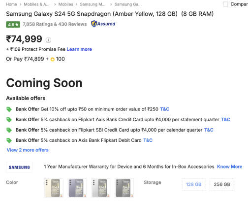नया Samsung Galaxy S24 Snapdragon फोन अभी मार्केट में सेल के लिए उपलब्ध नहीं हुआ है लेकिन शॉपिंग साइट फ्लिपकार्ट पर इसे प्राइस के साथ लिस्ट कर दिया गया है। यह 8जीबी रैम वाला 5जी फोन है जिसके 128जीबी स्टोरेज वेरिएंट का रेट 74,999 रुपये और 256जीबी मेमोरी वेरिएंट का प्राइस 79,999 रुपये बताया गया है। हालांकि हमें उम्मीद है कि आने वाली सेल में कंपनी इस स्मार्टफोन को लिस्ट प्राइस से कम रेट पर ही बिक्री के लिए उपलब्ध कराएगी।