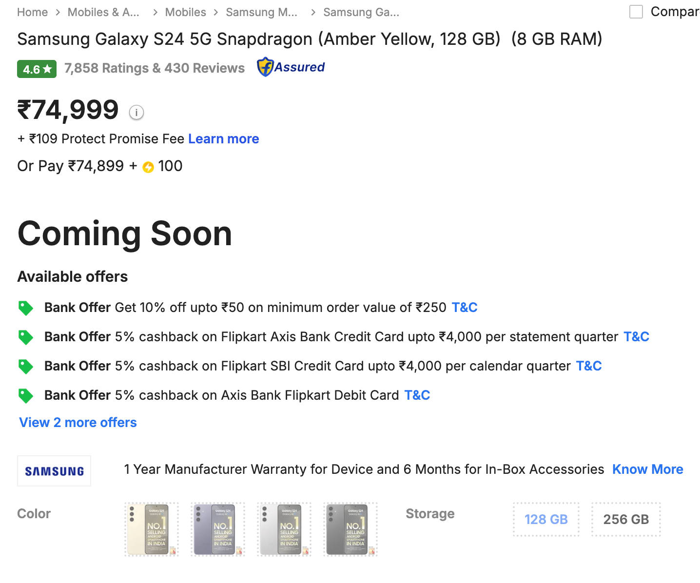 यह मोबाइल Onyx Black, Marble Grey, Amber Yellow और Cobalt Violet कलर में खरीदा जा सकेगा। बताते चलें कि पहले वाला गैलेक्सी एस24 5जी फोन भी 74,999 रुपये की शुरुआती कीमत पर लॉन्च हुआ था और अब विभिन्न शॉपिंग साइट्स पर डिस्काउंट व ऑफर्स के साथ सस्ते रेट में खरीदा जा सकता है। एक साल से भी अधिक पुराने Samsung Galaxy S24 5G फोन का यह Snapdragon कितना बिकेगा, यह तो आने वाला वक्त ही बताएगा।