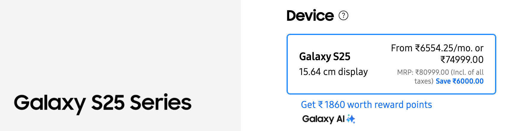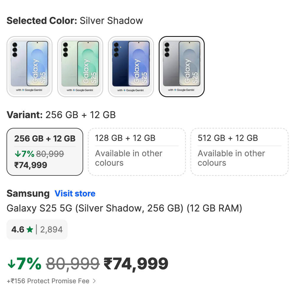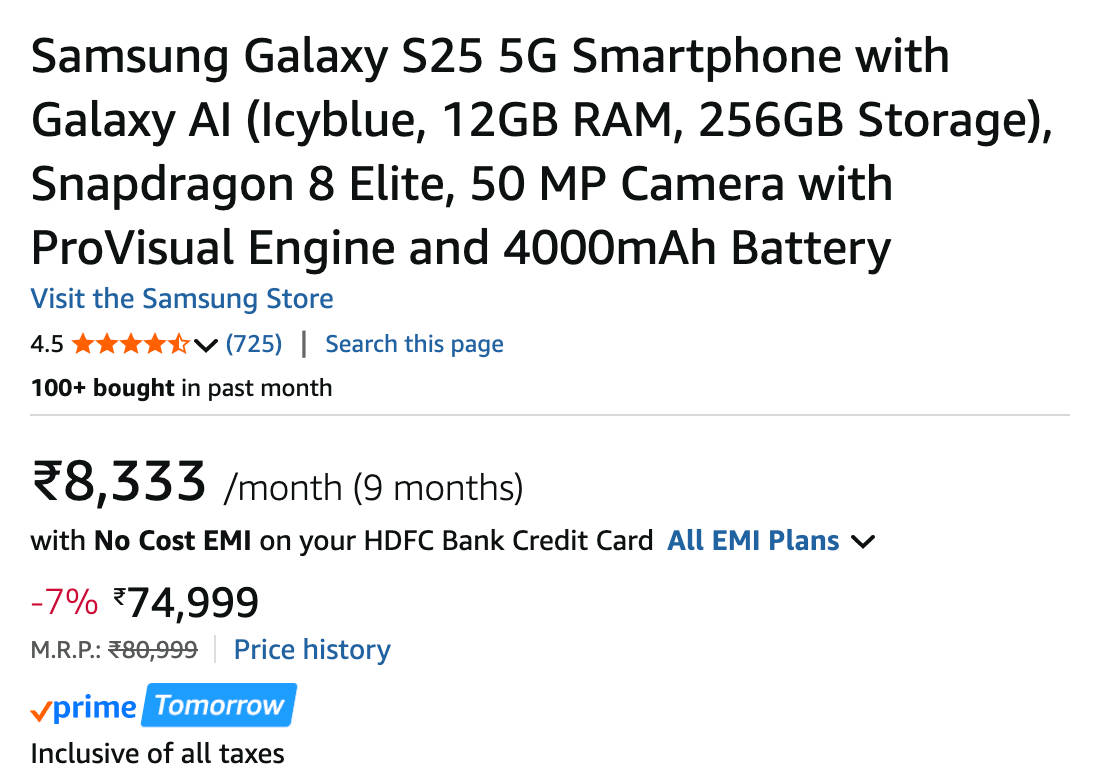 सैमसंग गैलेक्सी एस25 5जी फोन 12GB RAM + 256GB Storage के साथ 80,999 रुपये की कीमत पर इंडिया में लॉन्च हुआ था। लेकिन अब इस फोन मॉडल को 74,999 रुपये में सेल के लिए उपलब्ध करा दिया गया है। यानी Galaxy S25 को 6 हजार रुपये कम में परचेज किया जा सकता है। यह फोन का रियल सेलिंग प्राइस है और इतना सस्ता सैमसंग पाने के लिए किसी क्रेडिट कार्ड या कूपन इत्यादि की भी जरूरत नहीं पड़ेगी।