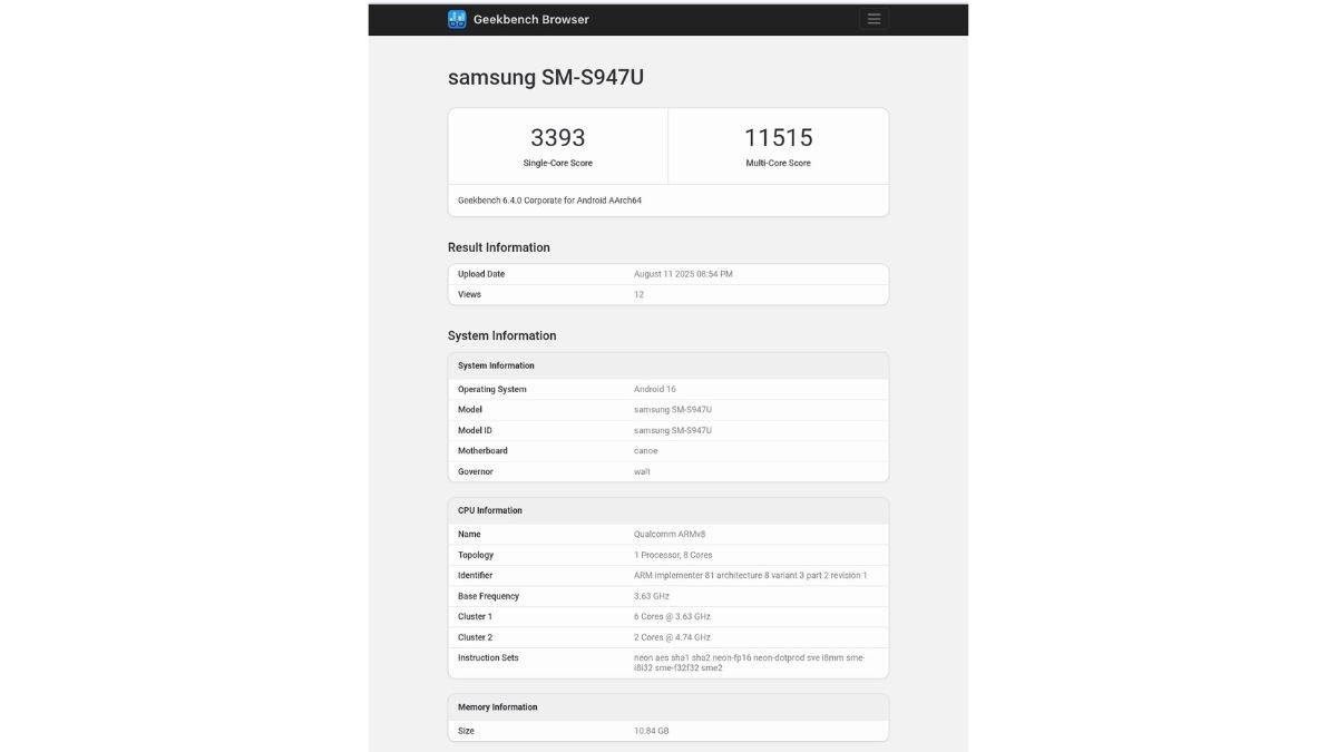गीकबेंच लिस्टिंग के अनुसार Samsung Galaxy S26 Edge मॉडल नंबर SM-S947U के साथ देखा गया है। डिवाइस ने सिंगल-कोर टेस्ट में 3393 और मल्टी-कोर टेस्ट में 11515 अंक हासिल किए हैं। जानकारी के अनुसार आगामी फोन में Qualcomm Snapdragon 8 Elite 2 प्रोसेसर दिया जा सकता है। जिसे 4.74GHz तक ओवरक्लॉक किया गया है और इसके साथ Adreno 840 GPU जोड़ा जा सकता है। सॉफ्टवेयर के मामले में यह डिवाइस बॉक्स से बाहर Android 16 और सैमसंग के लेटेस्ट One UI 8 कस्टम स्किन के साथ आने की उम्मीद है। इसके अलावा इसमें करीब 12GB रैम मिलने की बात सामने आई है।