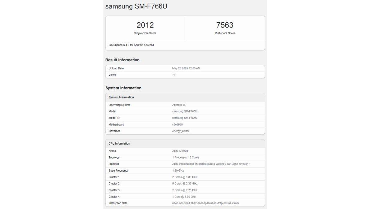 Samsung Galaxy Z Flip 7 Geekbench लिस्टिंग