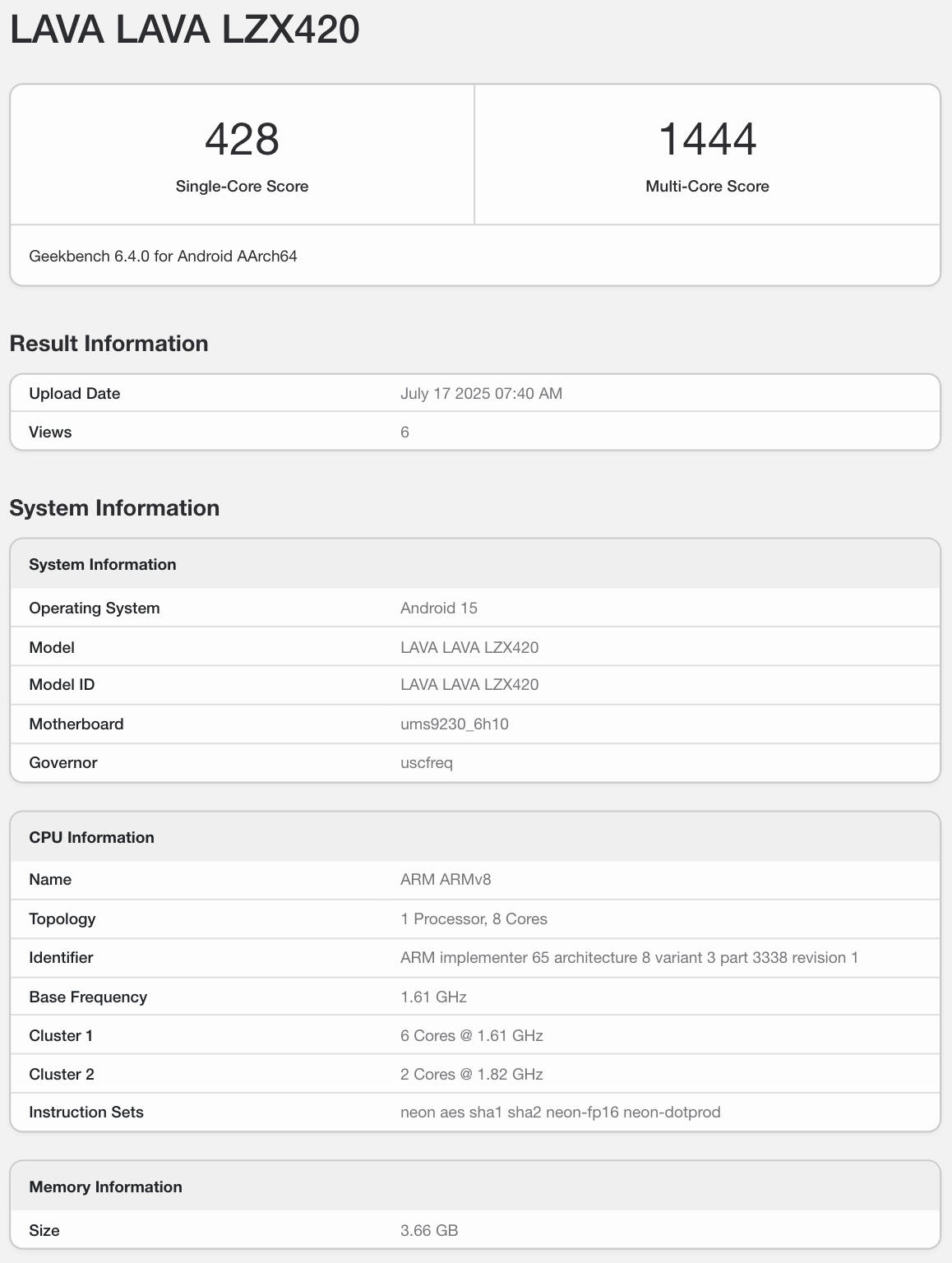 यही लावा मोबाइल आईएमईआई डाटाबेस के अलावा बेंचमर्किंग प्लेटफॉर्म गीकबेंच पर भी स्पॉट हुआ है। यहां फोन उसी मॉडल नंबर के साथ लिस्ट हुआ है जो Lava Shark 2 4G नाम के साथ IMEI डाटाबेस पर आया है। इस प्लेटफॉर्म पर अपकमिंग लावा स्मार्टफोन को लेटेस्ट Android 15 से लैस दिखाया गया है।