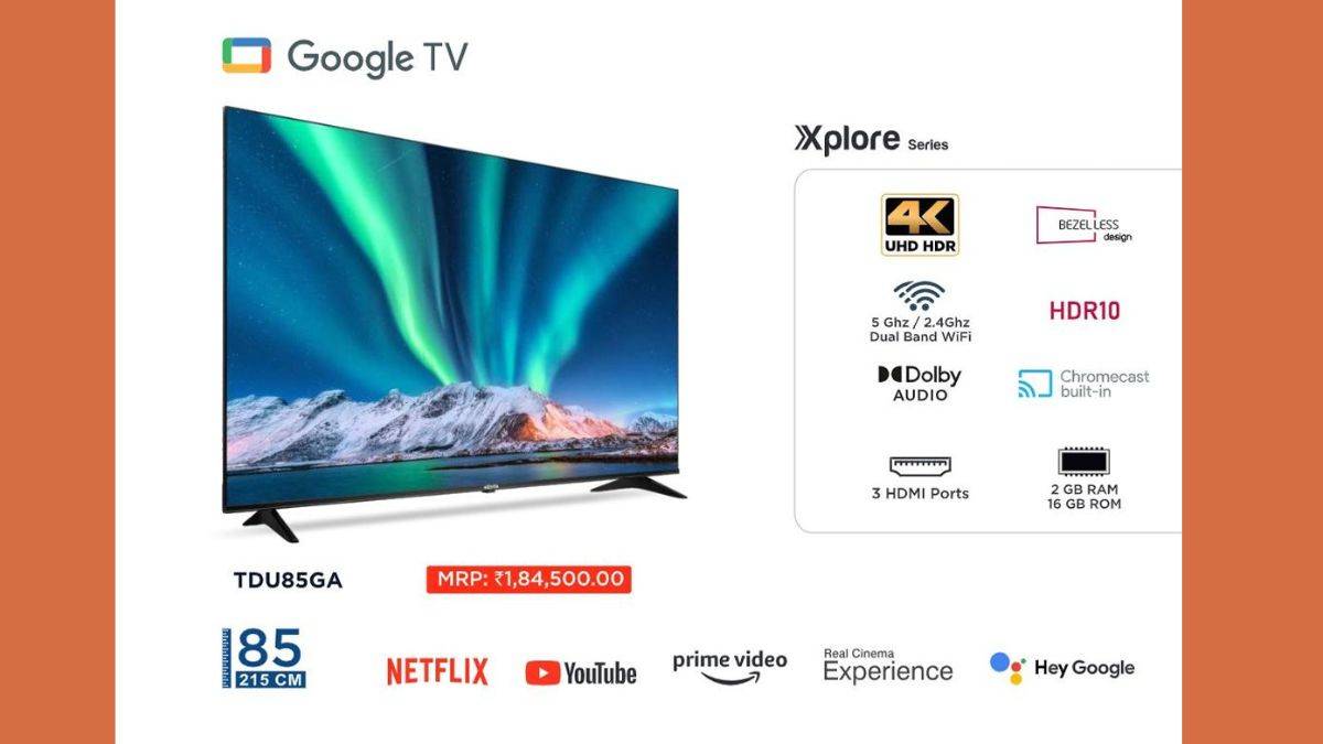 सीरीज का सबसे बड़ा मॉडल Elista TDU85GA है, जिसमें 215cm यानी 85 इंच का 4K Ultra HD पैनल दिया गया है। यह टीवी HDR10, Dolby Audio, 2GB RAM, 16GB स्टोरेज, बिल्ट-इन Chromecast और तीन HDMI पोर्ट्स के साथ आता है। बड़ी स्क्रीन के साथ थिएटर जैसी क्वालिटी के लिए इसे खास तौर पर बनाया गया है। हैंड्स-फ्री “Hey Google” वॉयस कंट्रोल और Netflix, Prime Video, YouTube जैसे OTT प्लेटफार्म तक इंस्टेंट एक्सेस इसे और भी प्रीमियम बनाता है। कंपनी ने इसकी कीमत 1,84,500 रुपये रखी है।