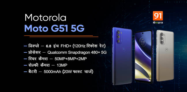 Moto G51 स्मार्टफोन की मुख्य स्पेसिफिकेशन्स की बात करें तो इसमें 120Hz डिस्प्ले, 50MP ट्रिपल रियर कैमरा और 5,000mAh बैटरी दी गई है।