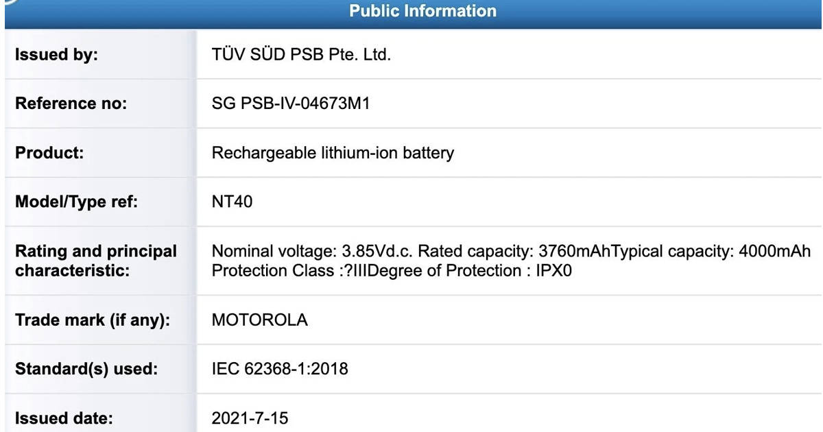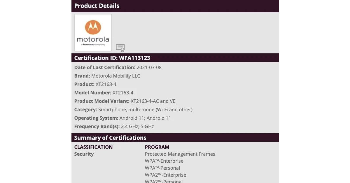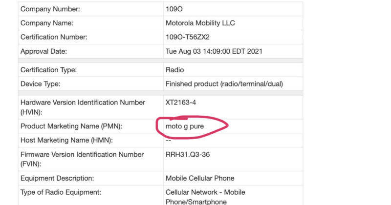 Moto G Pure को दरअसल विभिन्न सर्टिफिकेशन्स साइट्स पर देखा गया है। इस फोन को XT2163-4 मॉडल नंबर के साथ FCC, WiFi alliance और REL Canada सर्टिफिकेशन साइट पर भी लिस्ट किया जा चुका है। Motorola ने हालांकि अभी तक इस फोन को लेकर कोई ऑफिशियल जानकारी नहीं दी है लेकिन इन सर्टिफिकेशन्स में सामने आया है कि मोटो जी प्योर एंडरॉयड 11 आउट-ऑफ-द-बॉक्स ओएस पर लॉन्च किया जाएगा। वहीं TUV certification में खुलासा हुआ है कि यह मोटोरोला फोन 10वॉट फास्ट चार्जिंग तकनीक से लैस 4,000एमएएच की बैटरी सपोर्ट करेगा।