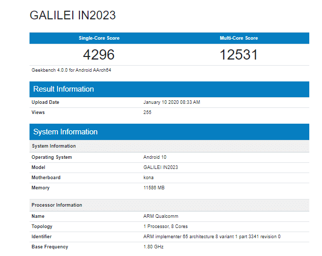 OnePlus 8 Pro को गीकबेंच पर ‘GALILEI IN2023’ मॉडल नंबर के साथ लिस्ट किया गया है। यह लिस्टिंग 10 जनवरी की है जिनमें वनप्लस 8 प्रो की कई बड़ी स्पेसिफिकेशन्स का खुलासाा हुआ है। सीधे स्पेक्स डिटेल की बात करें तो गीकबेंच के अनुसार OnePlus 8 Pro को एंडरॉयड के सबसे एडवांस ओएस एंडरॉयड 10 पर लॉन्च किया जाएगा। उम्मीद है कि बाजार में यह फोन एंडरॉयड 10 आधारित कंपनी के ही यूजर इंटरफेस ऑक्सिजन ओएस के साथ एंट्री लेगा। वहीं गीकबेंच पर OnePlus 8 Pro में दिए जाने वाले चिपसेट का कोडनेम ‘Kona’ बताया गया है।