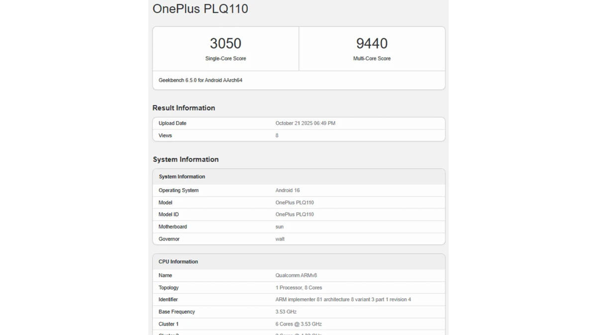अपकमिंग वनप्लस फोन गीकबेंच पर PLQ110 मॉडल नंबर के साथ लिस्ट हुआ है। यहां फोन का नाम तो नहीं बताया गया है लेकिन माना जा रहा है कि यह स्मार्टफोन OnePlus Ace 6 के रूप में ही लॉन्च किया जा जाएगा। सबसे पहले बेंचमार्क स्कोर पर ही नज़र डालें तो इसे सिंगल-कोर में जहां 3,050 प्वाइंट्स मिले हैं। वहीं मल्टी-कोर में इस वनप्लस स्मार्टफोन ने 9,440 स्कोर हासिल किया है।