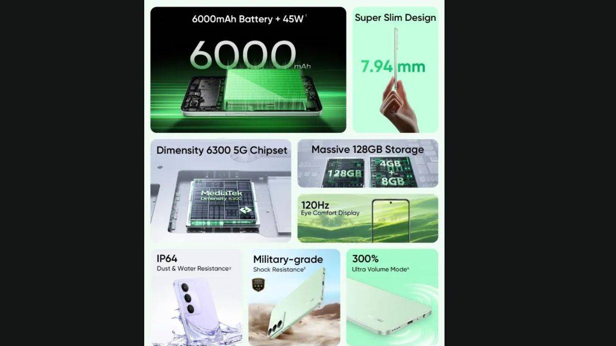 फोन में 6nm MediaTek Dimensity 6300 प्रोसेसर के साथ 8-core CPU और Mali G57 MC2 GPU दिया गया है। डिवाइस में 4GB रैम है। जिसे 12GB तक डायनेमिक RAM के जरिए बढ़ाया जा सकता है। डिस्प्ले के मामले में 6.67 इंच HD+ पैनल है इस पर 120Hz रिफ्रेश रेट मिल जाएगा।