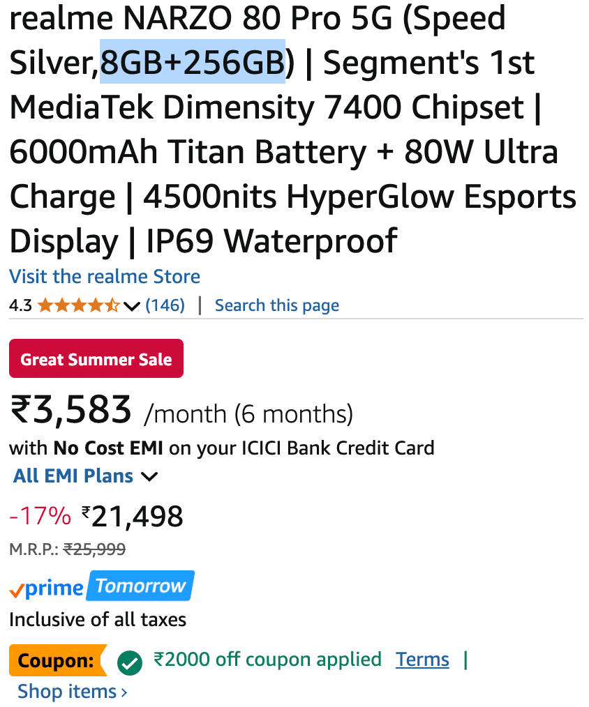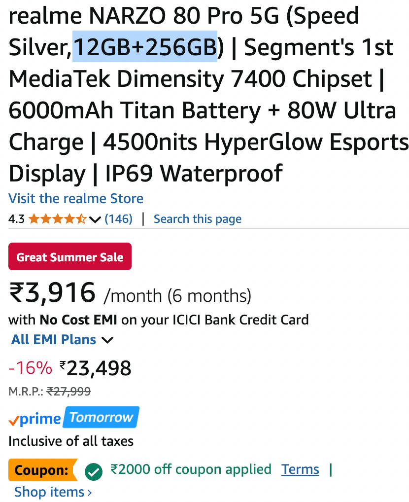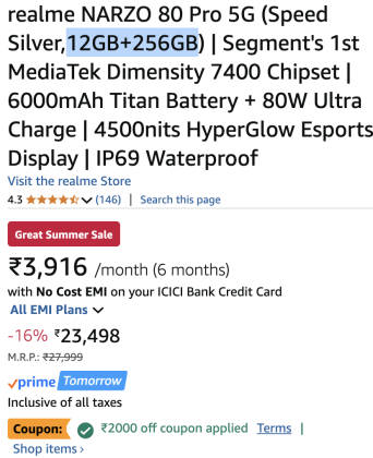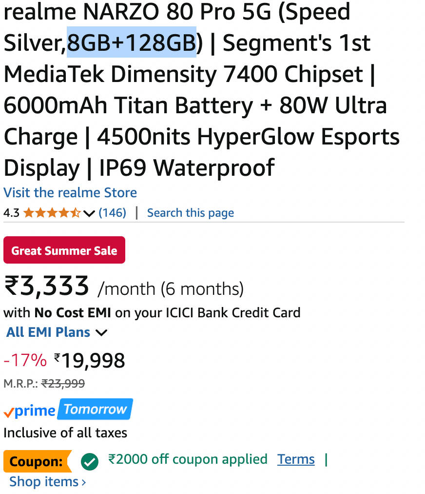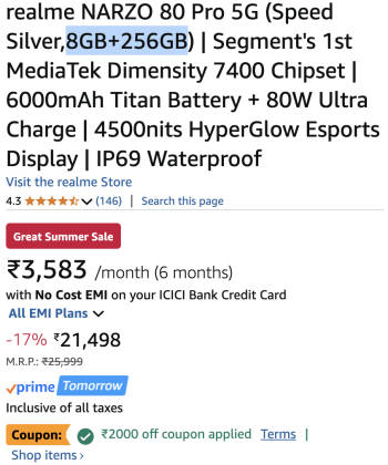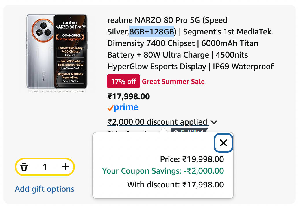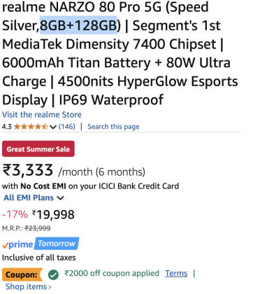 Realme Narzo 80 Pro के सभी मेमोरी वेरिएंट पर अमेज़न लिस्टिंग में ₹2,000 का कूपन डिस्काउंट मिल रहा है, साथ ही ₹1 का अतिरिक्त ऑफर भी दिया जा रहा है। इन दोनों ऑफर्स को मिलाकर फोन की शुरुआती इफेक्टिव कीमत ₹17,998 हो जाती है। कूपन को प्रोडक्ट पेज पर ‘Apply ₹2,000 Coupon’ बटन पर क्लिक कर ऐक्टिवेट किया जा सकता है। ₹1 का एक्स्ट्रा डिस्काउंट ऑटोमैटिकली अप्लाई हो जाता है।